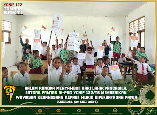 Kabupaten Keerom - Personel Satgas Pamtas RI-PNG Yonif 122/TS melalui Pos Sawiyatami memberikan Wawasan kebangsaan tentang Pancasila kepada anak-anak sekolah di SD Inpres Sawiyatami di kampung Sawiiyatami, Distrik Mannem, Kabupaten Keerom, Papua, Rabu (29-05-2024).